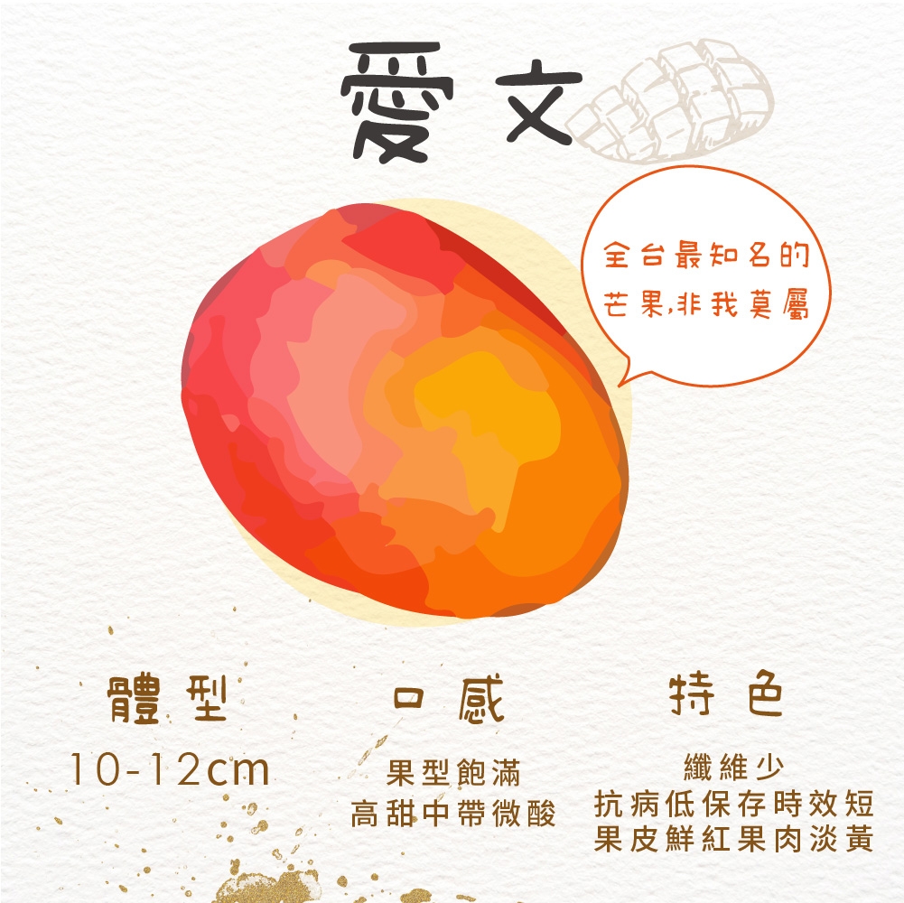 繼承愛文的好滋味,果肉細緻,幾乎無纖維不遜色愛文,酸度則比愛文低,是怕酸一族的首選。