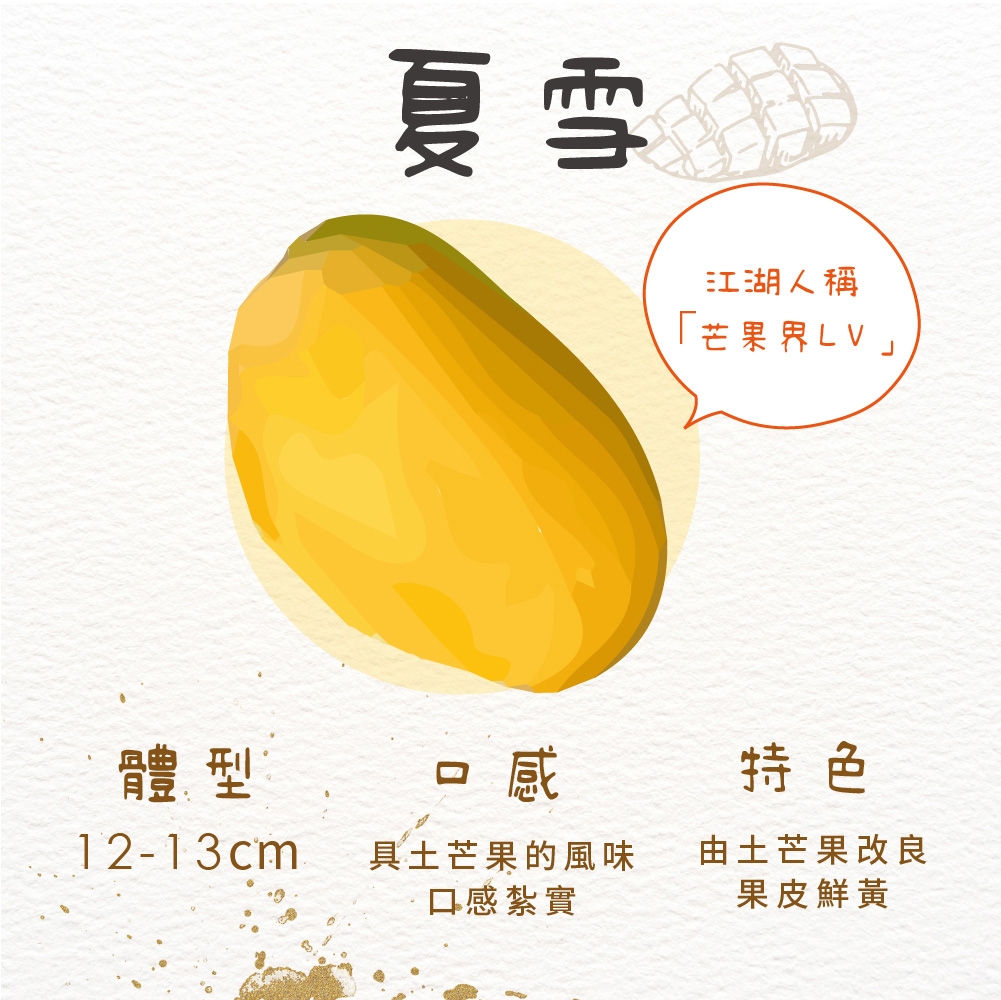 夏雪:產期約6~7月又名芒果界LV,由土芒果改良而來的夏雪,帶有土芒果的香氣。