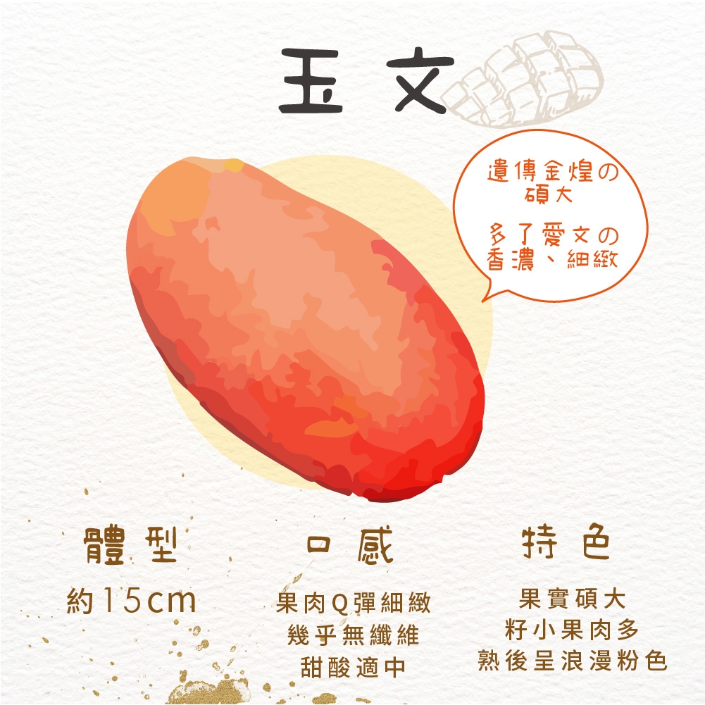 熟成後會呈現浪漫粉紅色,「玉文」遺傳金煌的外表,擁有碩大豐厚的果實,種子卻只佔了果實重量的6-8%