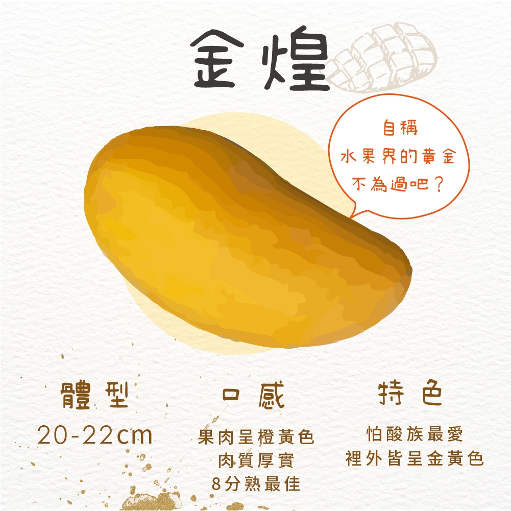 愛文:產期約4~7月在台灣,愛文可以說是最廣為人知且受大眾所青睞的品種之一。主要產地在屏東枋山、台南玉井、南化等地