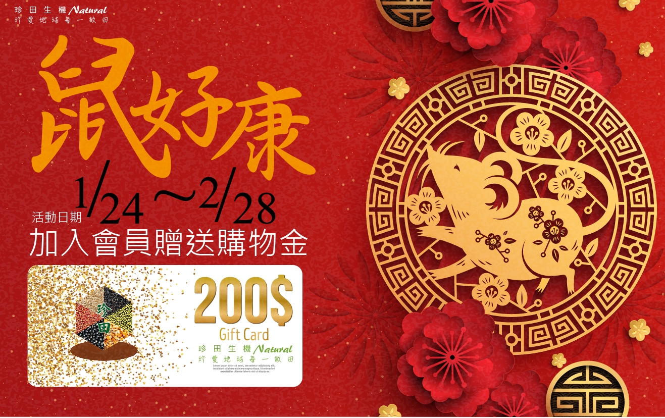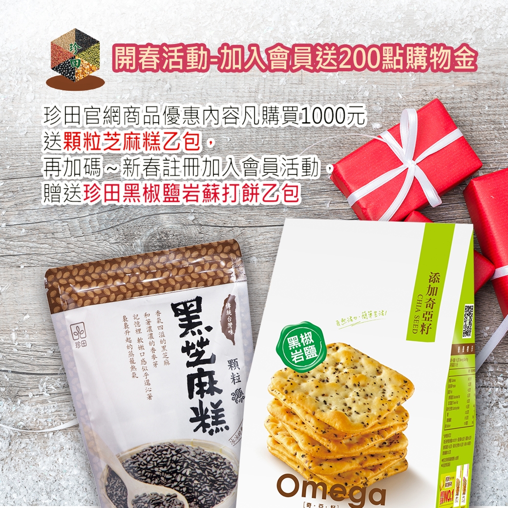 *開春暖心鼠好康活動-加入會員送200點購物金,再加碼~新春註冊加入會員成功,購物下單成功就贈送珍田黑椒鹽岩蘇打餅乙包,購買滿1000元及送顆粒芝麻糕乙包
