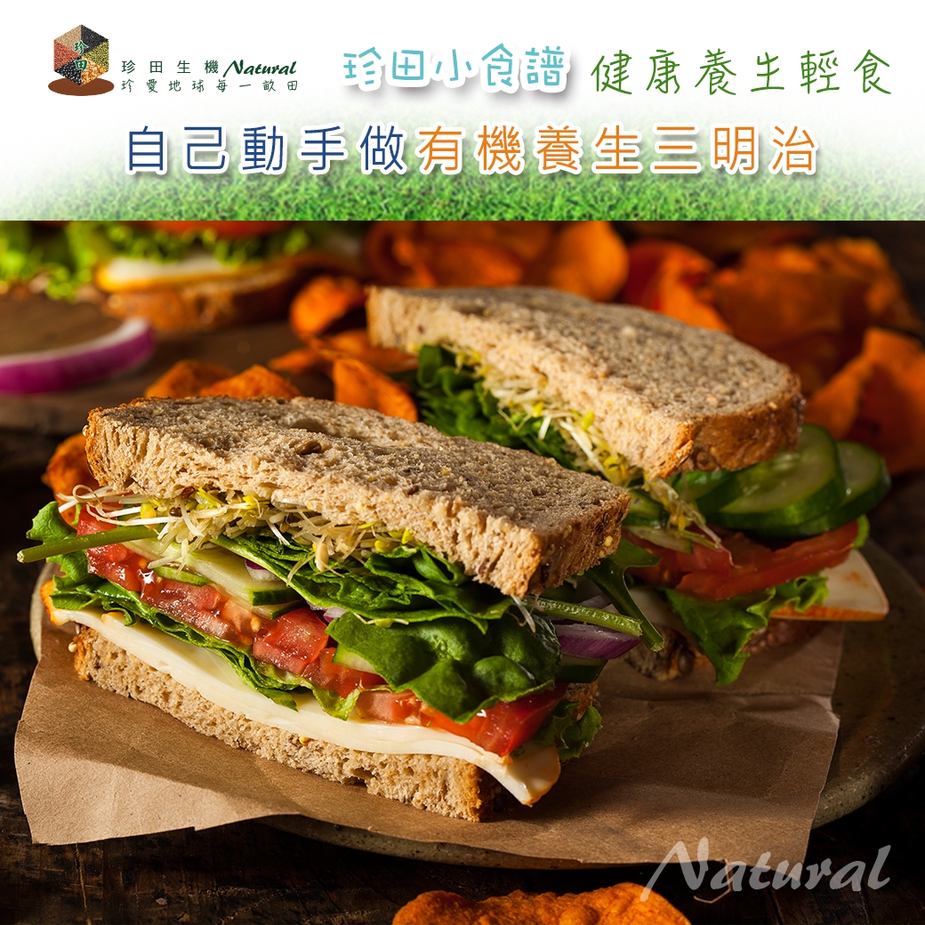 • 1、生菜葉、有機牛番茄、苜蓿芽、有機蘋果,洗淨並切片。 • 2、有機洋蔥洗淨切絲後,靜泡於清水中可除去嗆辣味。 • 3、蘋果切片,在清水加入一小匙鹽將其中浸泡,避免變色。 • 4、全麥吐司放入烤箱或者用平底鍋烘至麵包表皮酥脆。取出隨喜好抹上一匙加拿大亞麻仁油。 • 5、將所有的蔬菜瀝乾水分擺在麵包上,撒上珍田三寶粉再蓋上另一片麵包即完成美味可口的有機養生三明治!